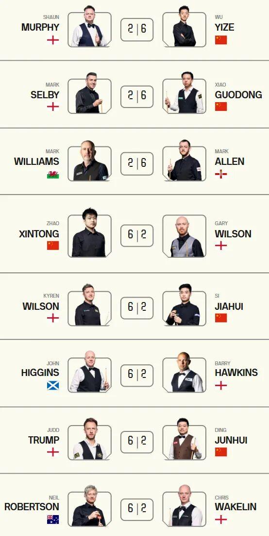 有意思的是,本届大师赛首轮所有比赛的比分均为6比2,祝大家2026年新年快乐!